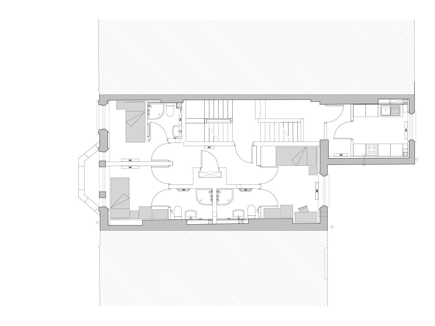 Section showing the main building with central paired bathrooms and bedrooms to the front and rear elevations.
