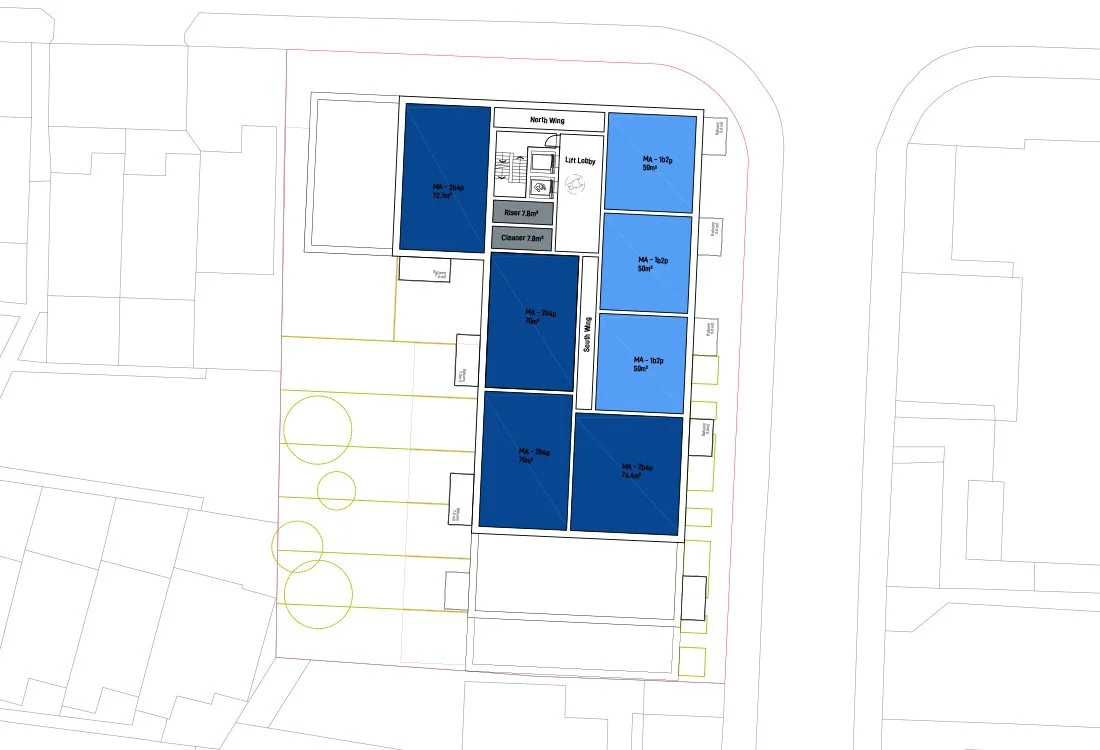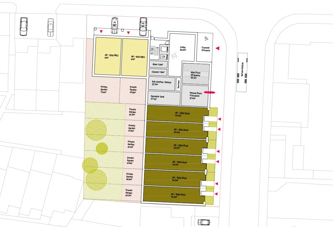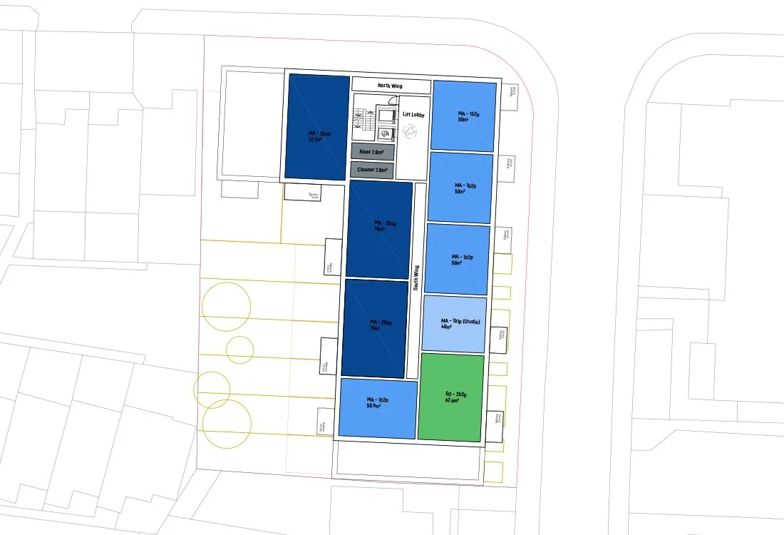 Ground floor plan - to maximise the development area and create a coherent built form, the entrance is in the corner of the block. Refuse and cycle stores are close to the entrance providing good access for all residents. The ground floor entrance is dedicated to access to floors above and services, all ground floor accommodation accessed directly from the street through private front doors.