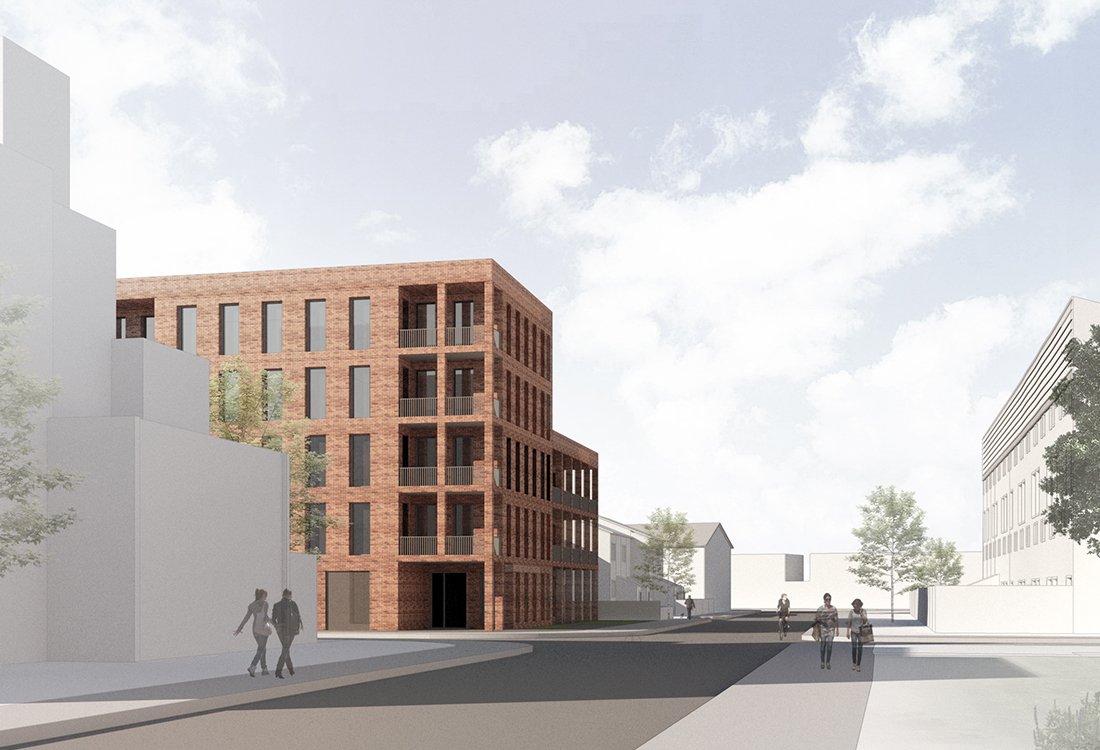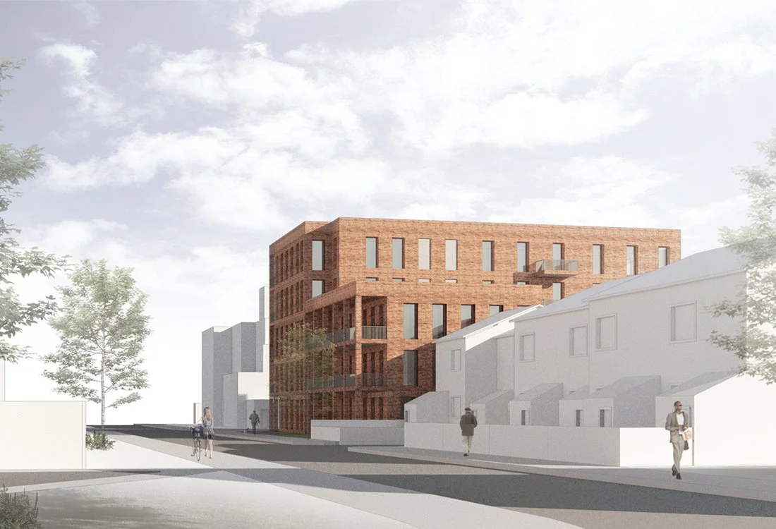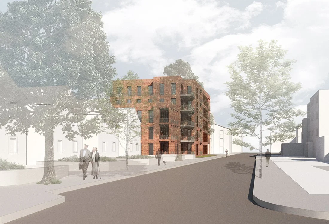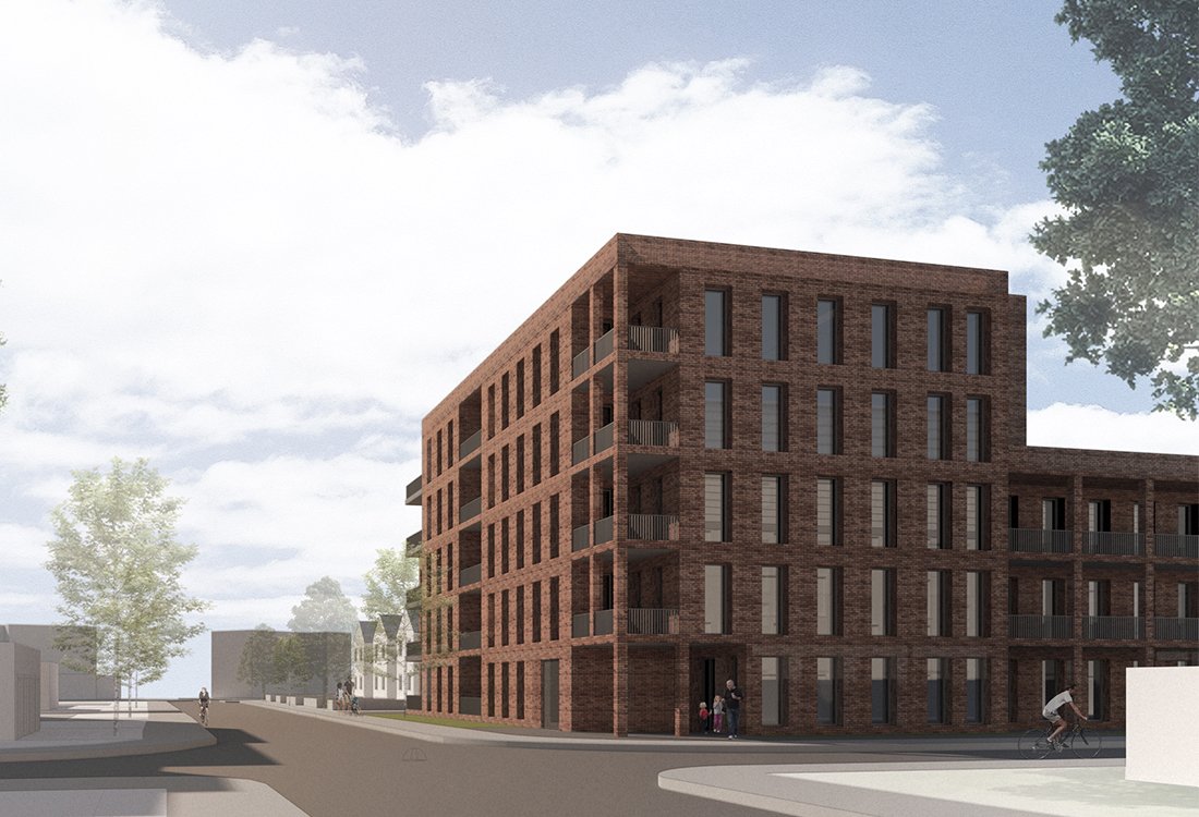 View looking south - showing the main massing on the corner of the site extending to the south to maximise street frontage. The massing steps down towards the west with units accessed from a north facing gallery.