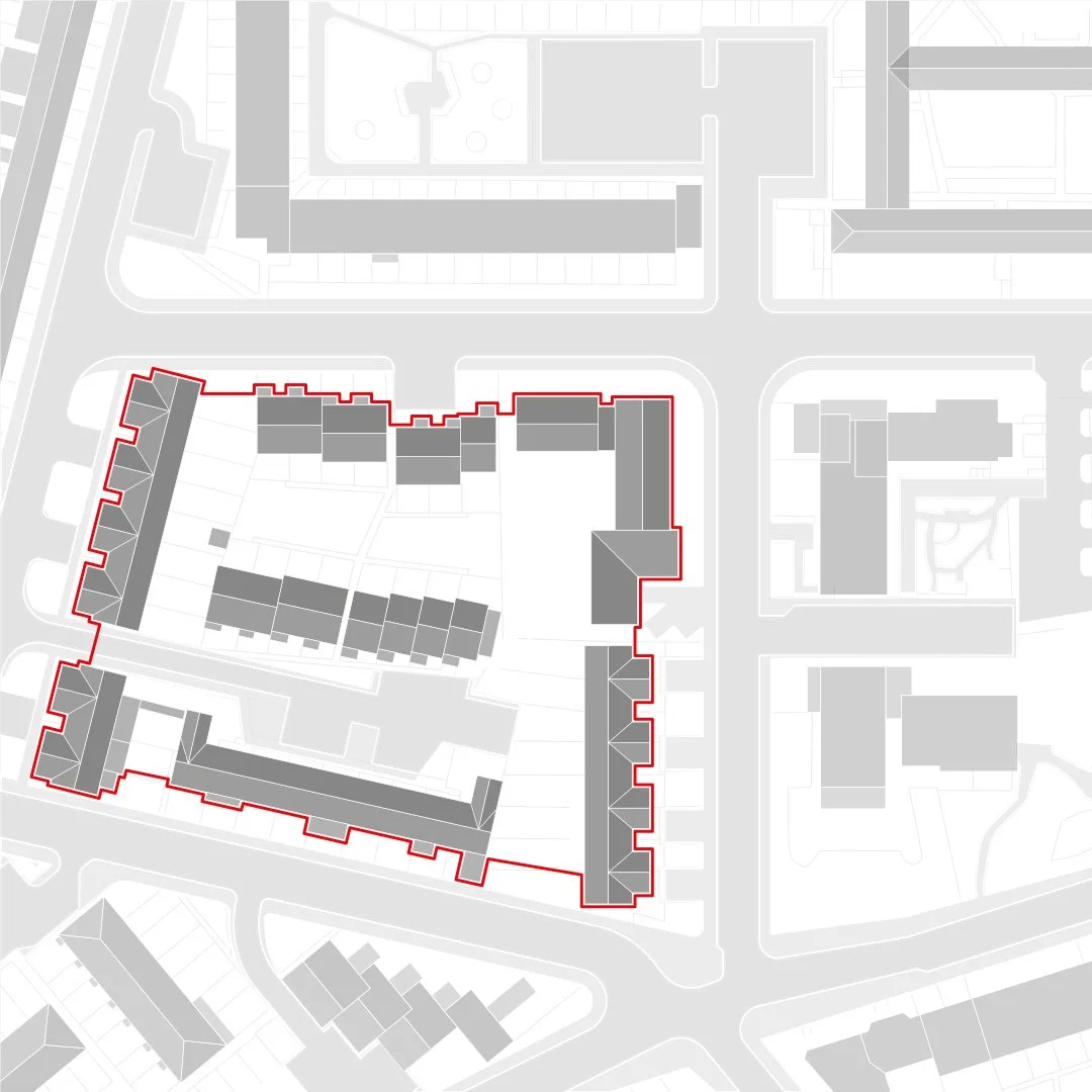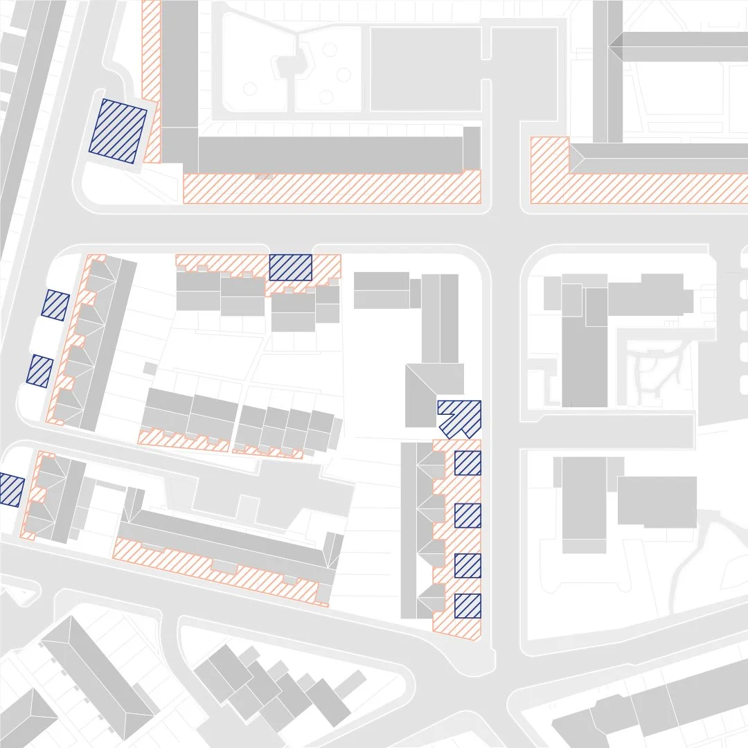 Urban block character - the urban block is comprised of staggered low rise family homes. Typically, buildings are set back from the street front creating an incoherent street character and poor overlooking of the surrounding streets.