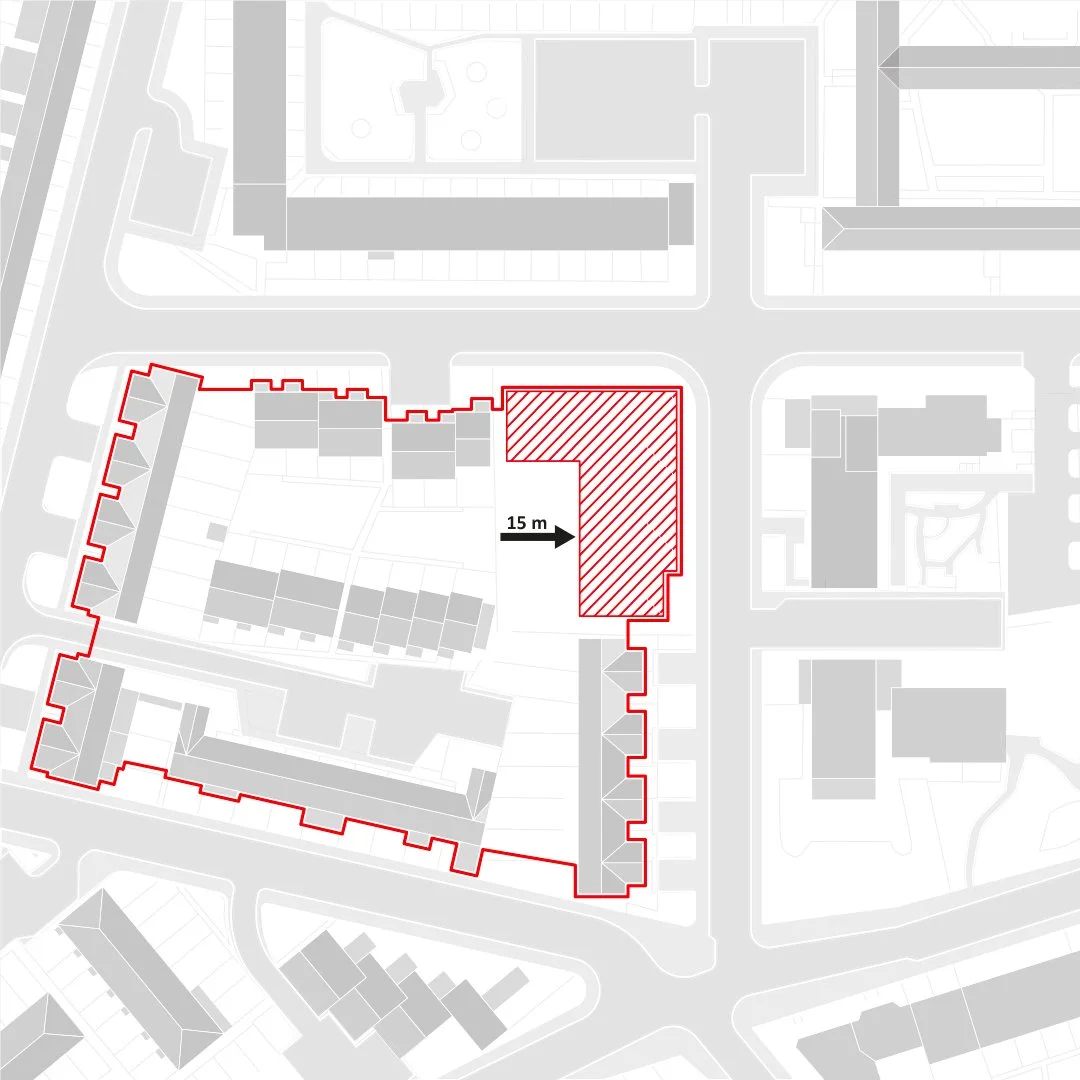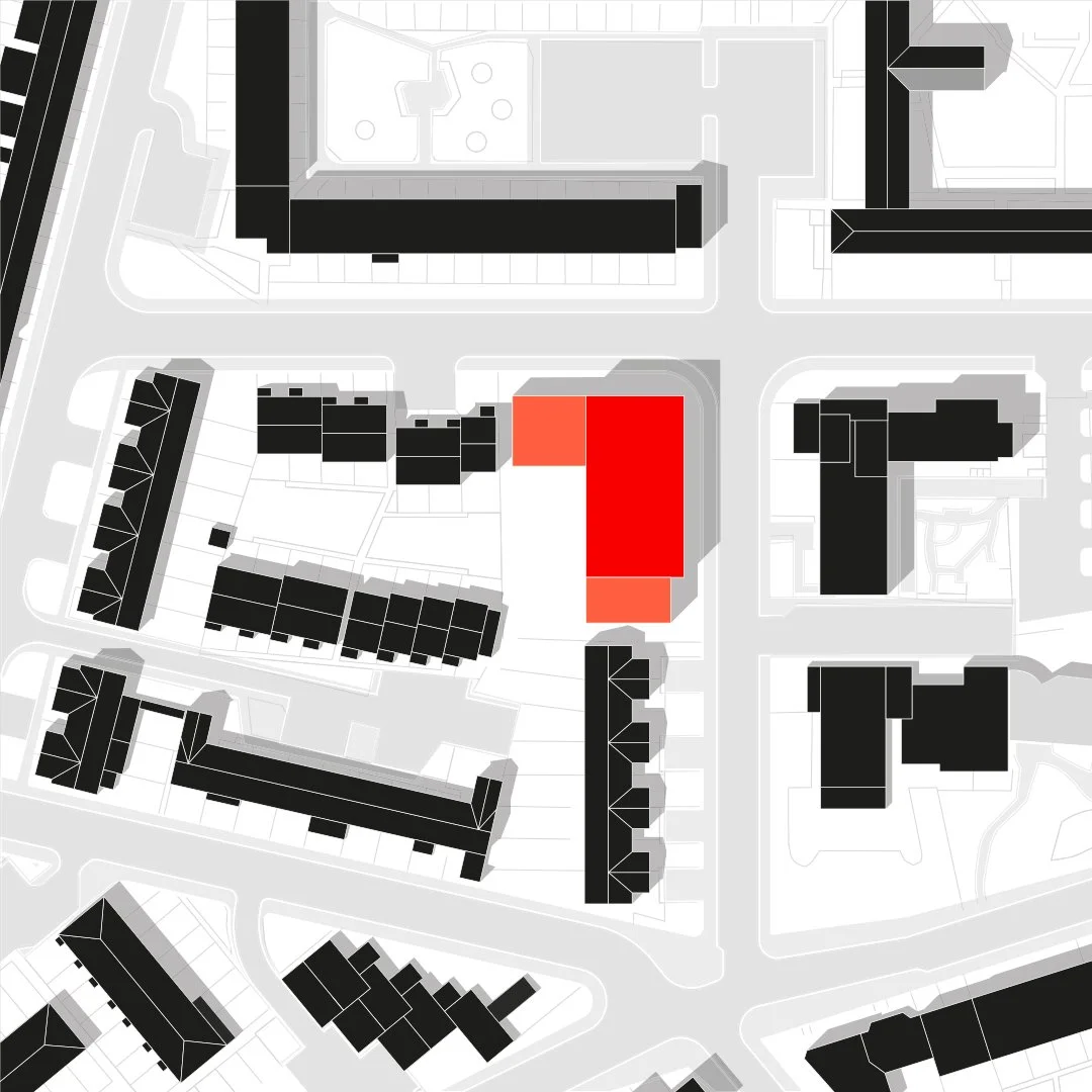 The proposal in context – a figure ground plan highlighting the location of the proposed development within the surrounding urban context and showing its response to adjacent buildings by stepping back.