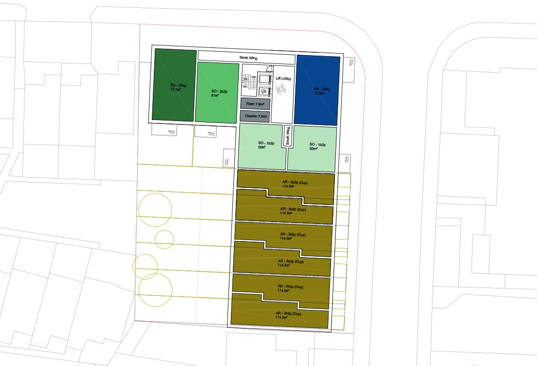 Stepping forward at the Corner - stepping forward at the corner, allows for a wider and more efficient north south block, maximising east and west facing apartments, and increasing duplex units. Stepping back from the western boundary maximises private gardens for the duplex and wheelchair units and reduces the perception of overlooking to the west.